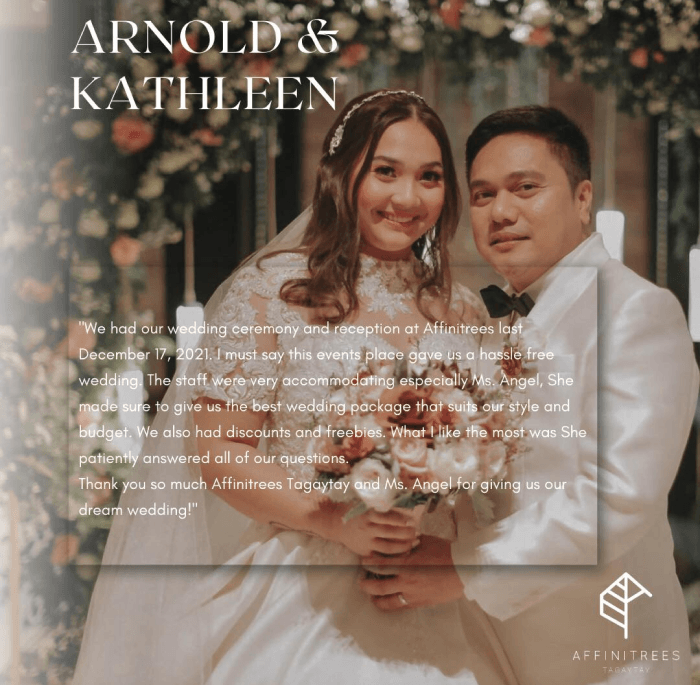 From initimate ceremonies to grand receptions, Affinitrees Tagaytay is committed to making every moment of your special day extraordinary! Celebrate and allow us to be of service, and we will give you a unique memory to remember!