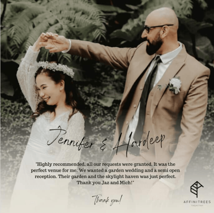 Celebrate your unique story in a unique wedding venue. With a cool climate, lush greens, and magnificent architecture. Affinitrees Tagaytay is here so you can create your most memorable experience.